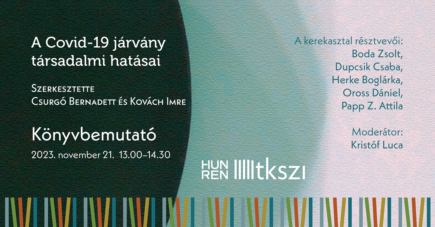 A Társadalomtudományi Kutatóközpont Szociológiai Intézete tisztelettel meghívja a Csurgó Bernadett és Kovách Imre szerkesztésében megjelent, A Covid-19 járvány társadalmi hatásai című kötet bemutatójára.