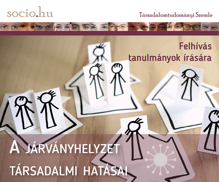 A Socio.hu Társadalomtudományi Szemle A járványhelyzet társadalmi hatásai címmel tematikus szám kiadására készül. A járványhelyzet teremtette társadalmi változások és kihívások témaköréhez kapcsolódó, elsősorban empirikusan megalapozott, saját kutatómunkára épülő, eredeti tanulmányok beküldésére biztatjuk az érdeklődőket. Örömmel várunk különféle módszertani megközelítésű, valamint más társtudományok szempontjait is szem előtt tartó írásokat.