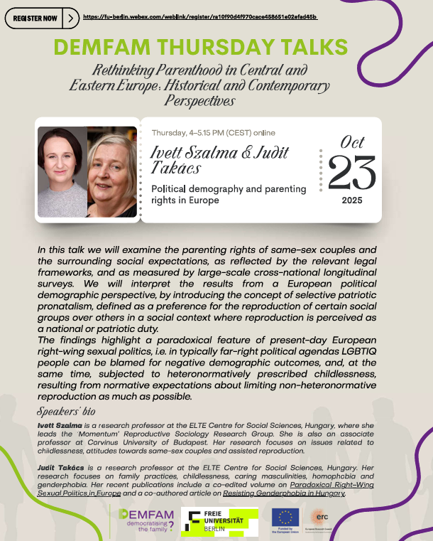 Szalma Ivett és Takács Judit előadást tartsanak a DEMFAM Thursday Talks sorozat keretében „Political Demography and Parenting Rights in Europe” címmel, október 23-án.